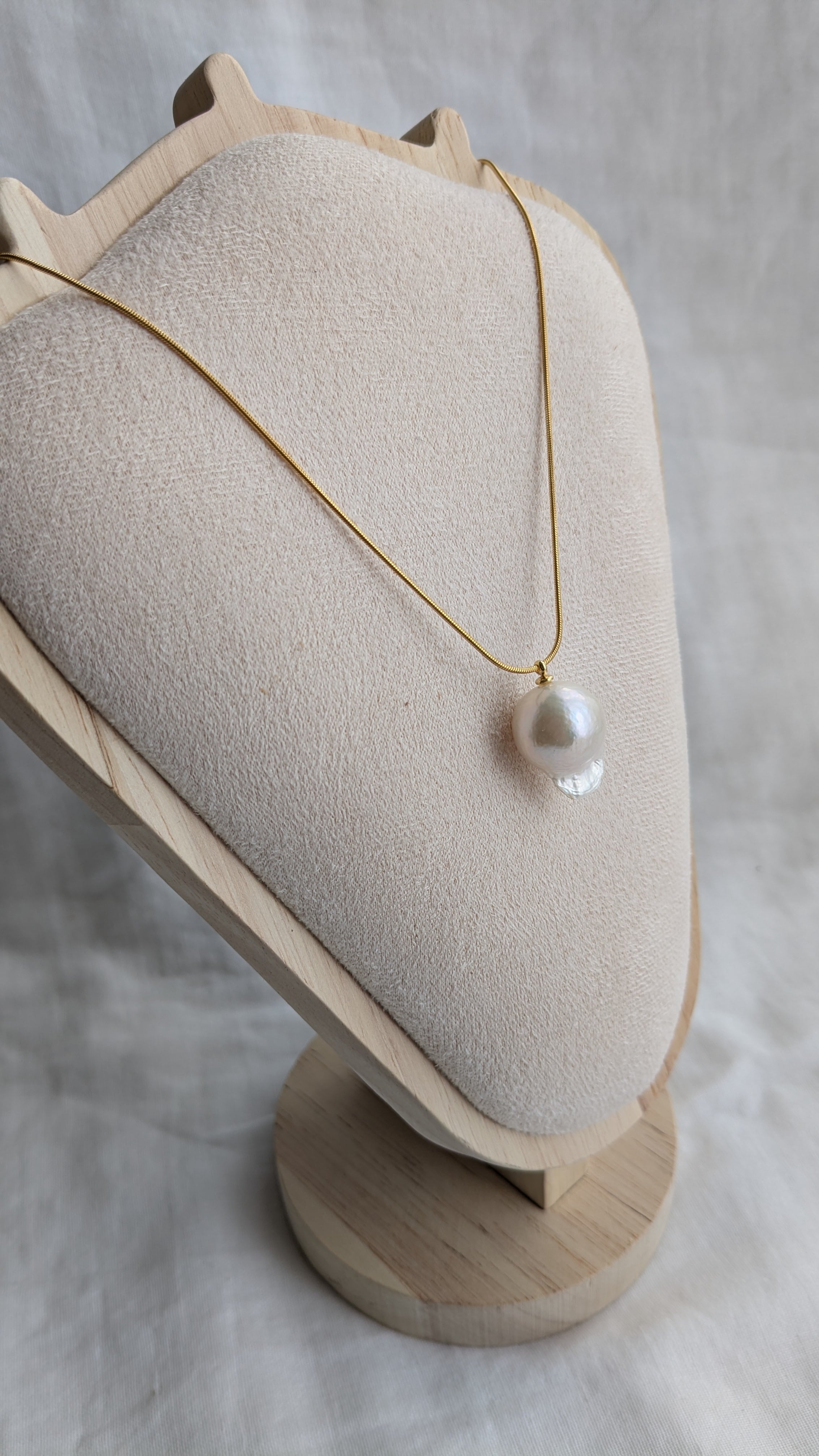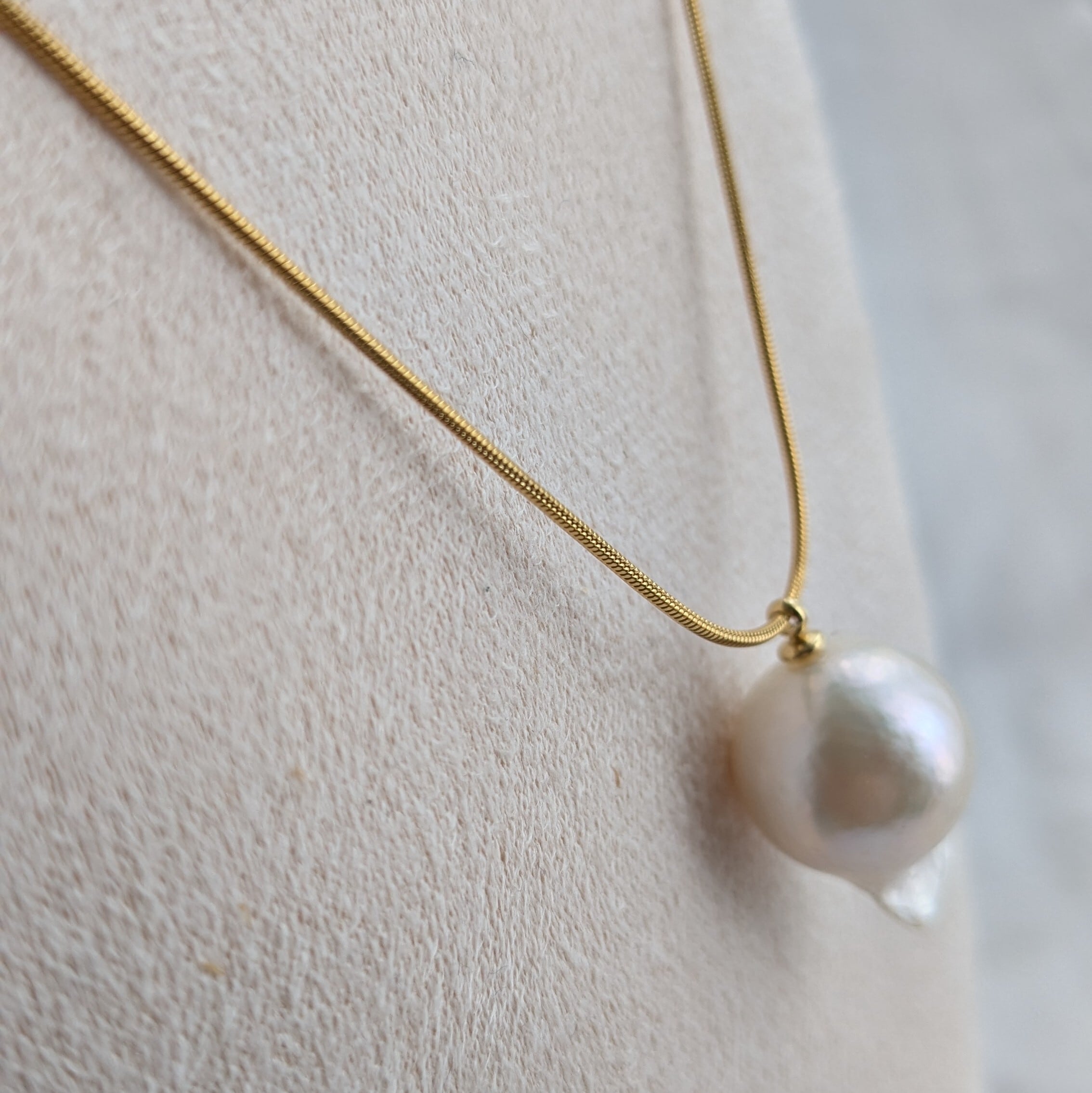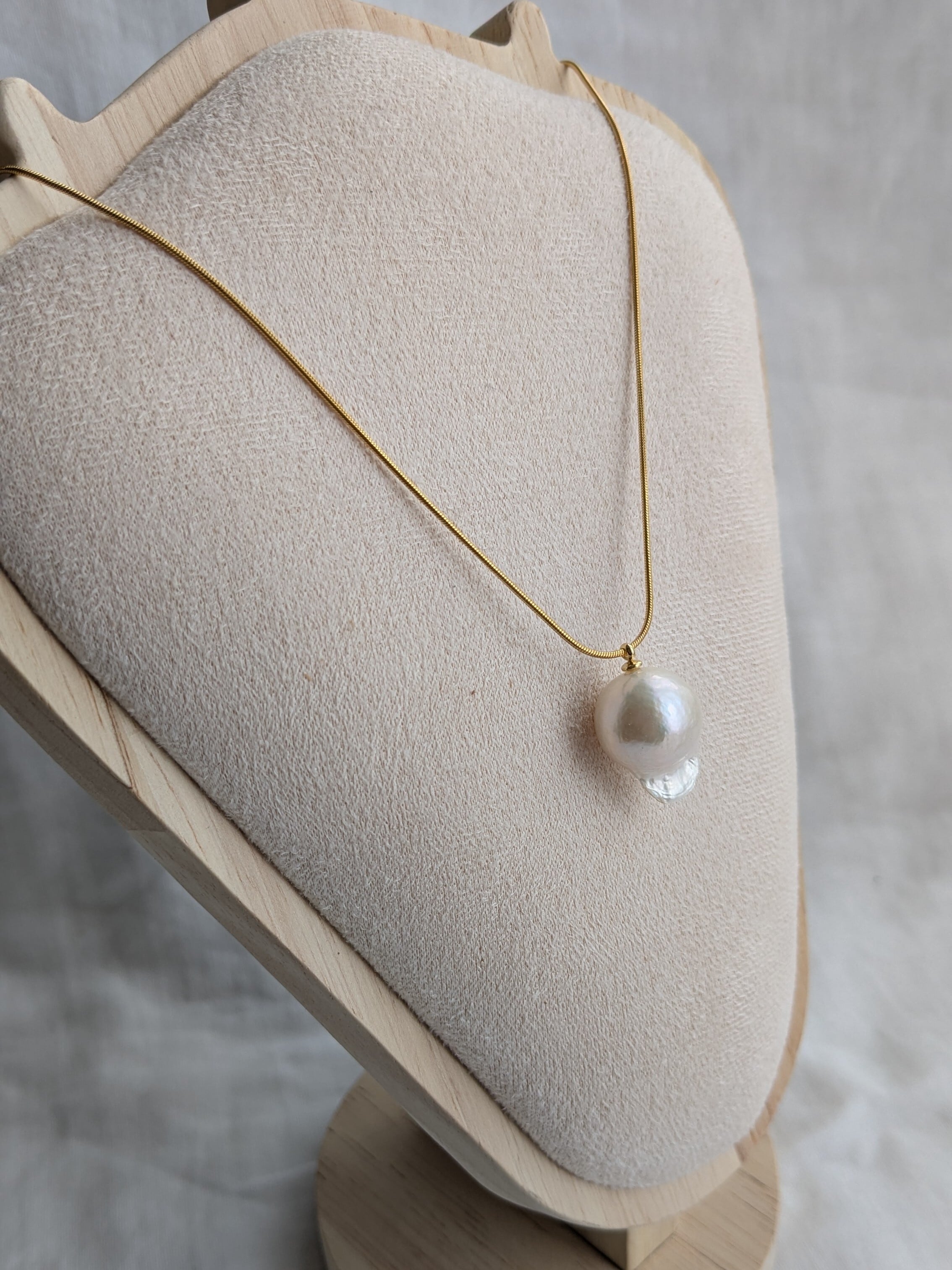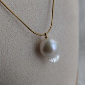 派手な光沢は無いものの優しい光沢と特徴的な羽根が付いている天然の淡水パールのネックレスです。