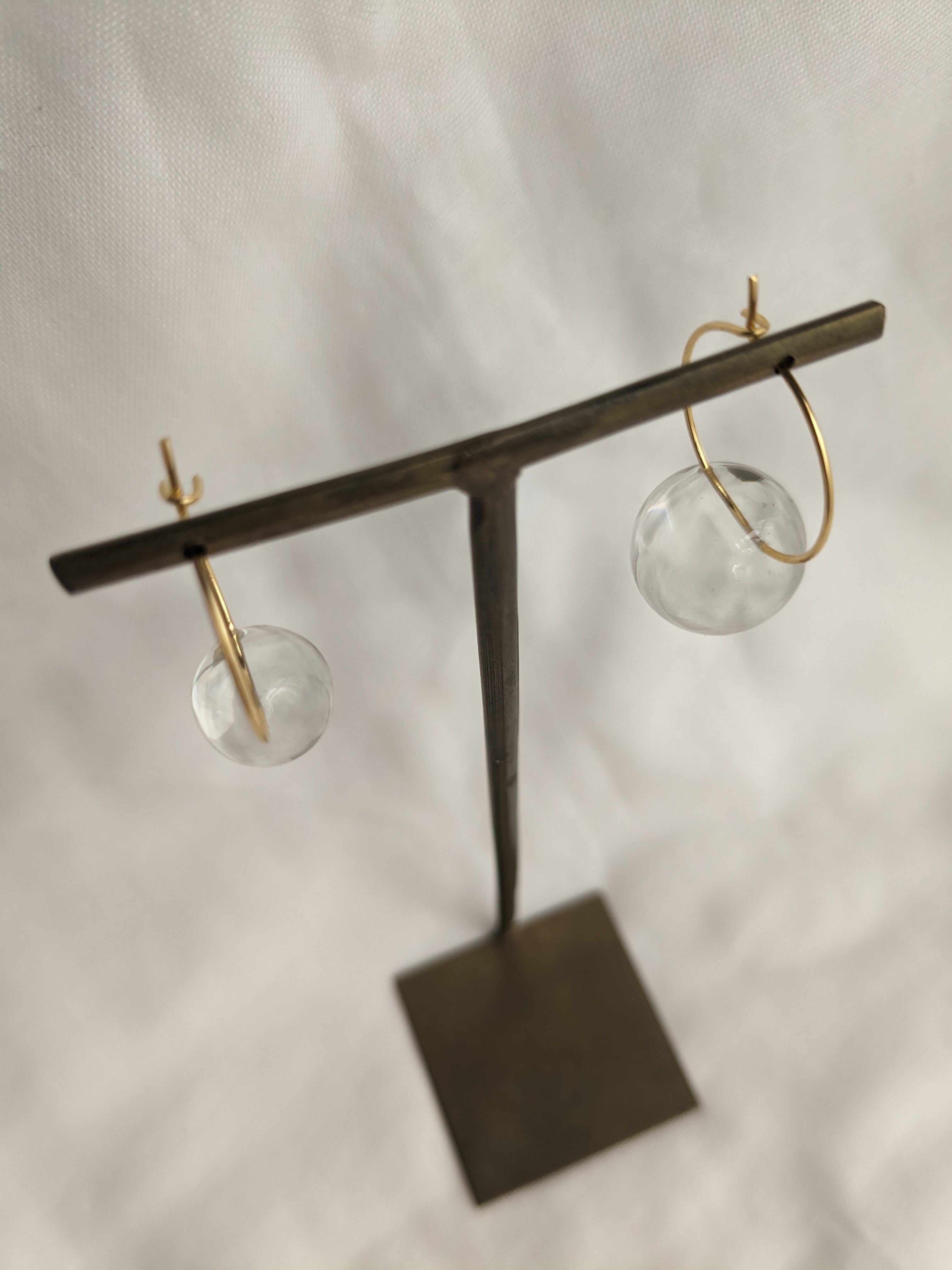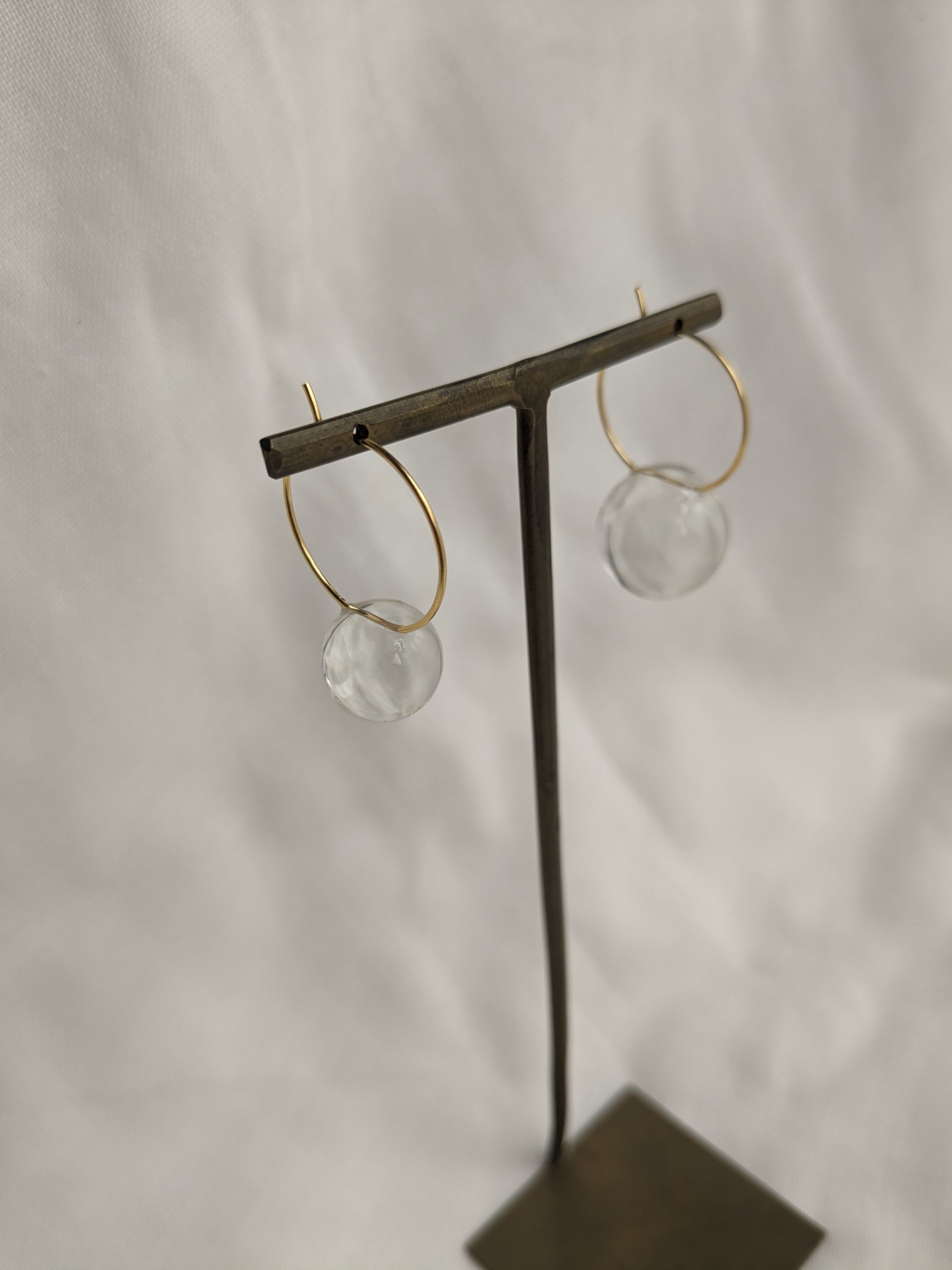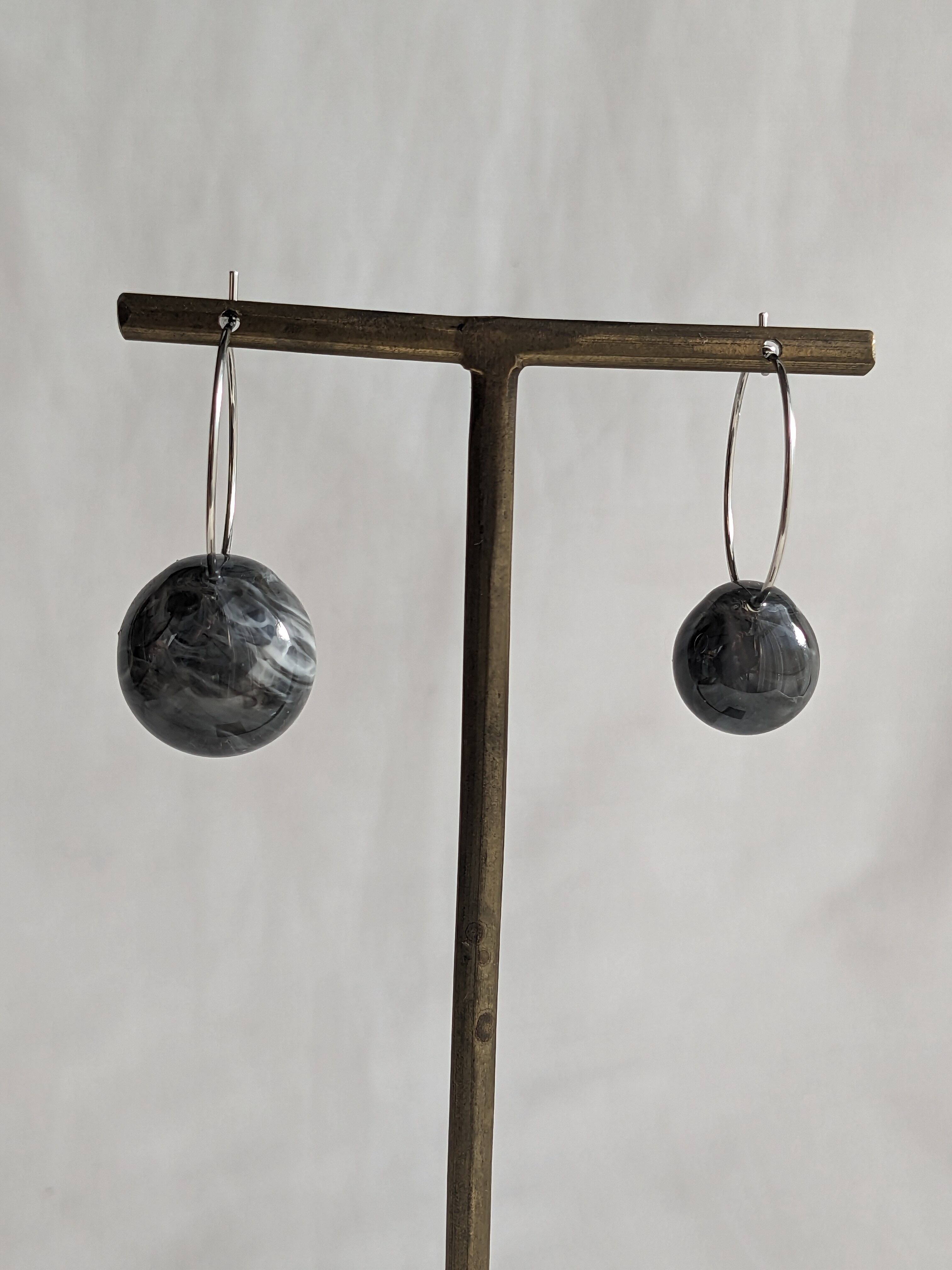 左右大きさの違うレジン球体をフープ金具と合わせた耳飾り。